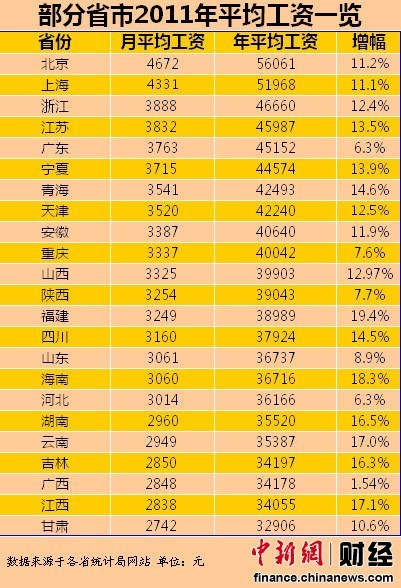 中新網7月6日電 (財經頻道 李金磊)中新網財經頻道統計發現,目前全國已有北京等23個省區公布了2011年城鎮單位在崗職工平均工資。數據顯示,在這23省區中,北京職工月平均工資最高,為4672元/月,其次是上海,為4331元/月,而排名墊底的是甘肅,僅為2742元/月。