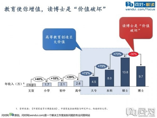 而在圖表上看到,讀博士是一種對價值的破壞。如果把個人教育比作壘積木,讀小學、中學、大學是一層層地壘起一幢樓房,讀碩士是在樓房上建了個金頂,而博士是一巴掌把樓房的頂打飛了。當然,讀博士的價值并非單純用薪水可以體現,很多博士生獻身科研,甘于做基礎研究工作,薪酬福利并不豐厚,肯定比不上少年發跡的低文化經商者;但其對科技發展的奉獻精神是無價的。