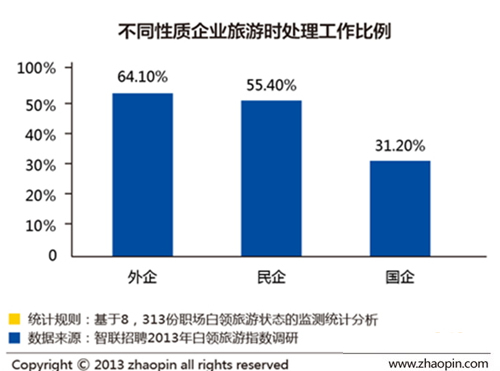 從職位上來看,管理層中近七成人在旅游時要處理工作。其中,在外資企業工作的人中,旅游時工作占比最高,為64.1%。