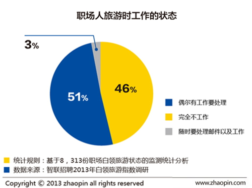 雖然白領期待通過旅游釋放工作壓力,但實際上,多數白領在旅游時并不能完全放松。智聯招聘此次調查表明, 51%的職場人表示他們在旅游期間還會開著手機和電腦工作,偶爾有工作要處理,無法全身心地陪伴家人和朋友度假,其中,男性職場人旅游時工作的比例高于女性。