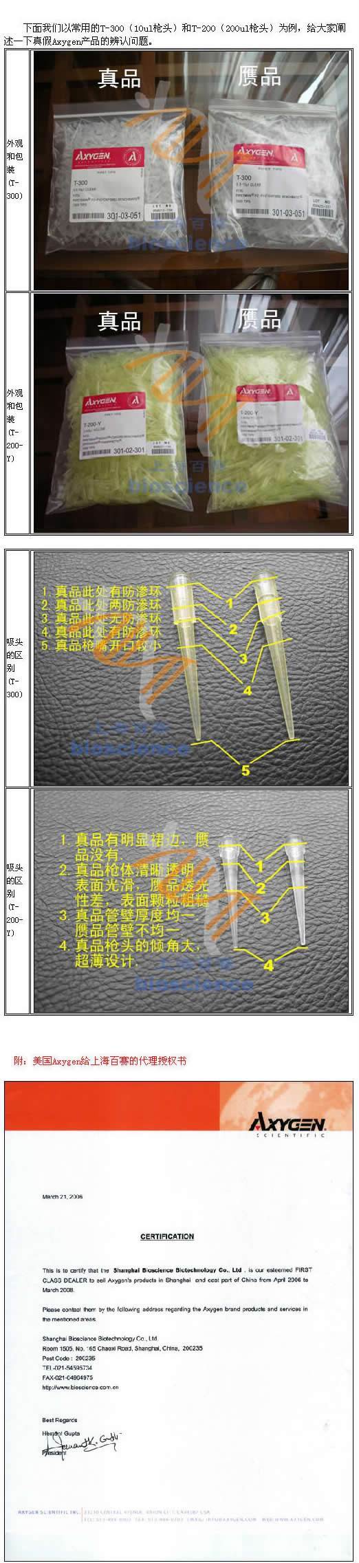 近來,一些國內的耗材生產廠商,在商業利益的驅使下,置廣大科研工作者的權益于不顧,開始生產假冒的Axygen產品,并且這些贗品已經迅速地出現在北京,上海等國內主要的科研產品市場上。這些假冒的Axygen產品,無論是在材料,做工還是質量控制,都是和Axygen產品無法比擬的。對于不小心購買了假冒Axygen槍頭的科研朋友來說,不僅僅是花了進口產品的價錢,買了國產質量的產品;而且,往往在莫名其妙的情況下,令實驗結果偏差,得不到理想的實驗產物和數據;浪費了大量的時間精力。甚至會造成整個實驗項目的報廢或者重大的醫療事故