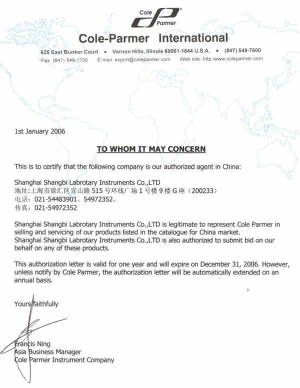 上海上碧實驗儀器有限公司成為美國coleparmer儀器中國地區總代理,下述文件特此證明: