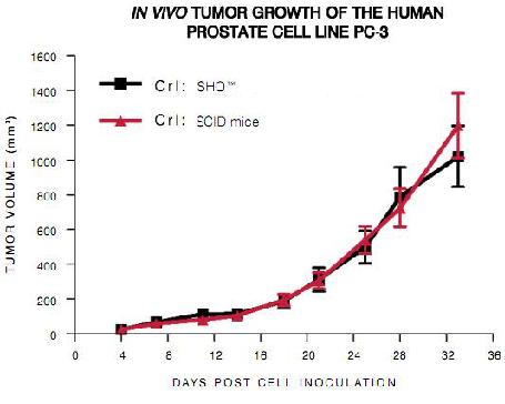 2008年6月,實驗人員通過對比的方法將人前列腺癌細胞株PC-3分別接種到SCID和SHO身上,研究發現,SHO除去具有與SCID小鼠相同的腫瘤生長特性之外,還摒除了Nu/Nu裸鼠接種PC-3時出現的皮膚潰瘍現象。