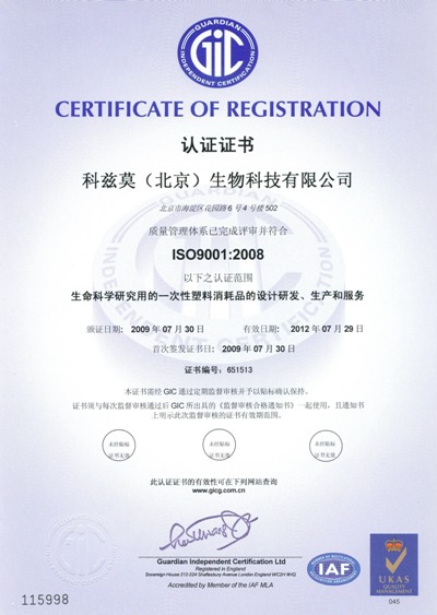 2009 年 07 月 30 日,科茲莫(北京)生物科技有限公司(Cosmo BioSciences Inc.)正式獲得了英國 UKAS 集團頒發的 ISO9001 質量管理體系認證證書,標志著科茲莫公司擁有了更完善的質量管理體系。
