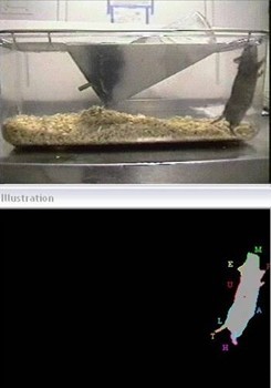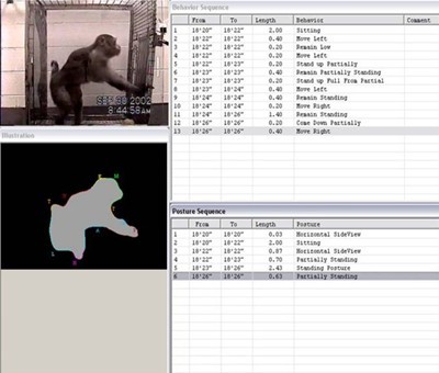 直立、下臥、走/跑、懸掛、跳躍、著陸、轉身、飲、食、咀嚼、嗅、挖、轉圈、梳理、伸展、抽搐、入睡、醒來、排尿等的觀察記錄分析成為可能,如下圖: