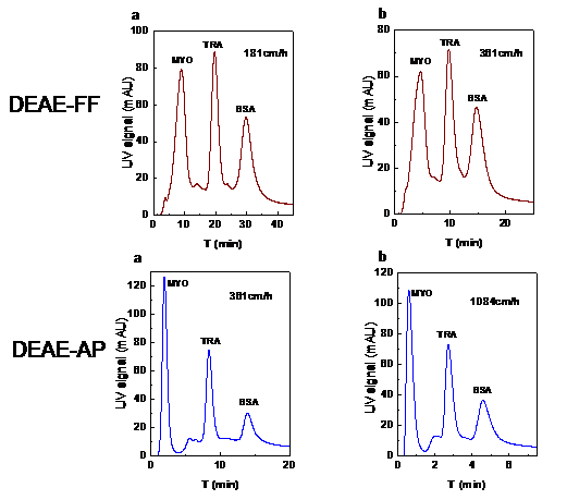 以肌紅蛋白、轉(zhuǎn)鐵蛋白和牛血清白蛋白的混合溶液為模擬體系,考察不同流速下超大孔聚苯乙烯陰離子交換介質(zhì)(DEAE-AP)的分離效果,并與DEAE Sepharose 4FF介質(zhì)進行了對比。實驗結(jié)果(圖2)顯示,作為對照的DEAE-FF介質(zhì)在流速達到361 cm/h時,分離效果已明顯降低,而超大孔介質(zhì)可以在流速高達1084 cm/h的條件下操作,分離效果良好,能夠在6 min內(nèi)實現(xiàn)三種生物大分子的快速分離。