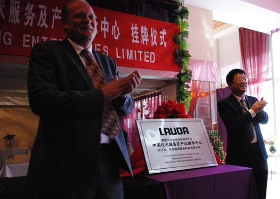 LAUDA公司測試儀器部總監Frank Jansing 先生(左)和北京盛維基業總經理王雷先生為中心揭牌。