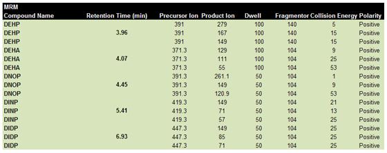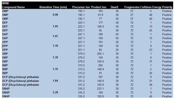 ,同時搭配簡單萃取與稀釋的樣品前處理方法,可同時分析13種鄰苯二甲酸酯類增塑劑:DMP、 DEP、 DAP、 DPP、 DBP、BBP 、 DCP (Dicyclohexyl phthalate) 、 DNHP、 DEHP、 DEHA、 DNOP、DINP和DIDP。
