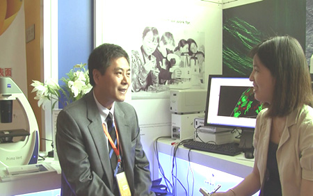 張育薪 博士:我們這次現場展示了高端、中端和低端三款產品。其中LSM780是高端7系列共聚焦顯微鏡的一種,它的優勢就在于采用的新型GaAsP光譜檢測器非常靈敏,可以捕捉到單分子熒光信號。另外一款是中端的光切重建顯微系統Viva Tome,它采用光切成像原理高速捕捉活細胞3D圖像。還有一款低端的Primo Vert倒置顯微鏡,這款倒置顯微鏡可以廣泛應用于科研實驗室、醫院等。該產品提供2種成像模式,一種是內置相機,另一種是傳統雙目觀測。另外,我們還有最新的超高分辨率顯微鏡預計將會在明年展出。