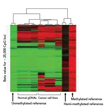 該芯片設計了450,000多個甲基化位點,全面覆蓋了96%的CpG島,并根據(jù)需求加入了CpG島以外的CpG位點、人類干細胞非CpG甲基化位點、正常組織與腫瘤(多種癌癥)組織差異甲基化位點、編碼區(qū)以外的CpG島、miRNA啟動子區(qū)域和已通過GWAS的疾病相關區(qū)域的位點,同時覆蓋了Human Methylation27 BeadChip的90%的位點。每張芯片可平行進行12個樣本的檢測。