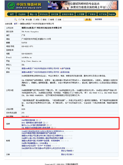 最近,許多公司都制作了一些優秀的視頻,放置在自己公司的網站或上傳到一些開放的視頻網站,如優酷,土豆網,酷6網,微博等。為了給企業提供一個視頻展示平臺,也為了滿足許多用戶查找,瀏覽本行業內相關視頻的的需要,中國生物器材網經過精心策劃和準備,開發了視頻鏈接服務功能,并于近日開通上線。