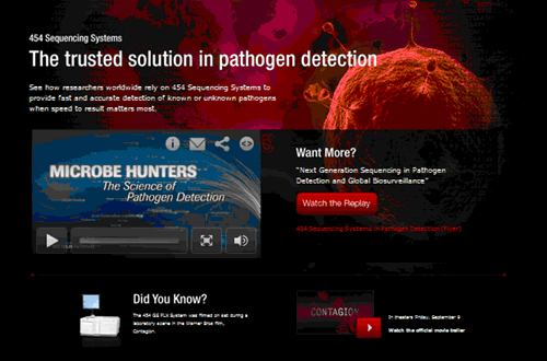 五位來自世界各地的 研究人員,哥倫比亞大學的Ian Lipkin教授、Tahoe研究中心的Evan Skowronski、香港大學的Si Lok、國際家畜研究學院的Steve Kemp以及巴西Evandro Chagas研究所的Marcio Nunes 現身說法 ,闡述了羅氏454系統在其實驗研究中的應用,相關內容專門拍攝成了一部20分鐘的名為“Microbe Hunters: The Science of Pathogen Detection”的短片。哥倫比亞大學的Ian Lipkin作為正式影片傳染病(Contagion)的專業顧問,作為傳染病研究專家,介紹了該領域近年來的技術發展。香港大學的Si Lok教授回顧了他們利用GS Junior系統快速鑒定今年爆發的猩紅熱病毒。Tahoe研究中心的Evan Skowronski闡述了該機構在菲律賓的兩個分支機構在最近爆發的兩次疫情中的工作。國際家畜研究學院的Steve Kemp利用454系統在肯尼亞開展人畜共患疾病的研究,而巴西Evandro Chagas研究所的Marcio Nunes則介紹了熱帶叢林中各種病原體的檢測工作。 觀看完整的采訪短片請訪問:http://www.my454.com/applications/pathogendetection/index.asp