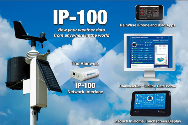 IP-100可以實現前所未有的多種格式傳輸和輸入。可以通過我們高技術、免費永久觸摸屏顯示器、或者通過Rainwise iPhone 程序來實現是否在線連接,這樣你就可以隨時隨地擁有可用氣象數據。