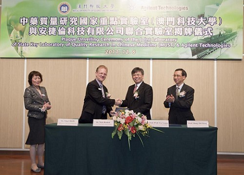 2011 年12月6 日,北京—安捷倫科技公司與澳門科技大學今天聯合宣布,雙方在澳門科技大學成立液相色譜/質譜聯合實驗室,將國際一流的液相色譜/質譜領先科技引入中藥質量研究國家重點實驗室(澳門科技大學),為傳統中醫藥研究的現代化和國際化注入活力,攜手為中國中醫藥創新研究和產業升級貢獻力量。