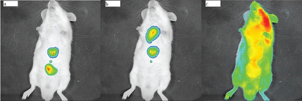 Bio-Real公司與上海交通大學聯合在中國申請了一項發明專利“稀疏采集通道下基于背景熒光消除的目標熒光光譜解混方法”,專利號ZL201110230395.0。用這項新技術,可以在僅有4-5個熒光波長采集通道下,對小鼠和裸鼠體內的熒光分子成像,能夠準確分離出目標熒光和自發熒光等復雜背景熒光,并且還能準確分解混和目標熒光標記,區分兩種以上的混合熒光分子標記。