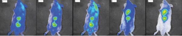 圖1.帶毛小鼠多光譜熒光分子成像采集效果,5通道圖像中帶毛小鼠的自發熒光比較強烈,我們在小鼠的三個部位做了熒光標記,最上面標記位置的熒光劑是AF594,最下面標記了熒光劑AF488,中間是二者以50%比例混合。上圖從左到右分別是在525, 542, 579, 624, 716nm通道下采集的圖像。
