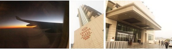 圖:飛機上看到的日落余暉(左) 展團下榻的皇冠假日國際五星級酒店(中、右)