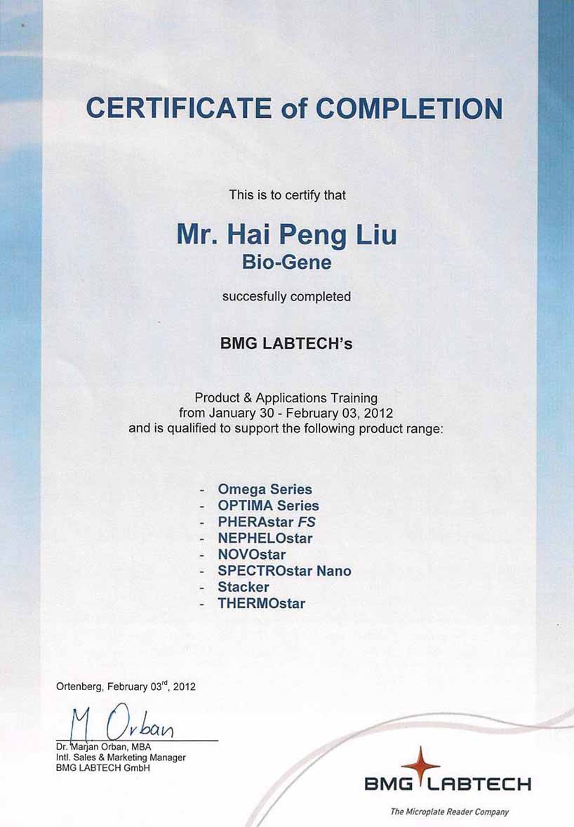為了最大程度為客戶提供專業,完善的服務,本公司工程師近期接受德國BMG Labtech公司邀請,親赴德國參加BMG多功能酶標儀的專業培訓。通過此培訓,我司工程師獲得BMG公司的培訓資格認證證書,使我公司BMG多功能酶標儀的專業服務實力更加強大與可靠,更加有能力為新老客戶帶來最完善的服務。