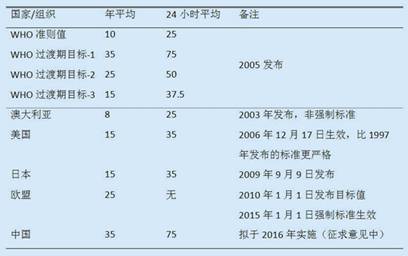 世界衛(wèi)生組織(WHO)和一些國(guó)家的PM2.5標(biāo)準(zhǔn)(單位:微克/m3)