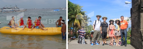 左圖:上船了 右圖:展團(tuán)中參加旅游行程的展商在海神廟前