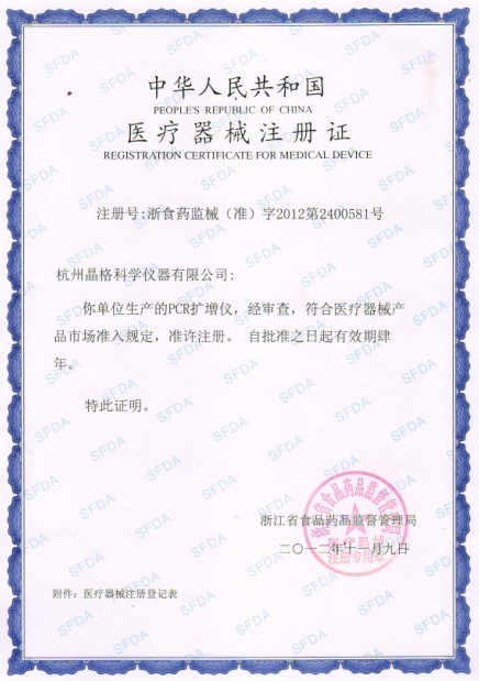近日,在所有晶格員工的共同努力下,杭州晶格科學儀器有限公司生產的PCR擴增儀通過浙江省食品藥品監督管理局審查,獲得中華人民共和國醫療器械注冊證。