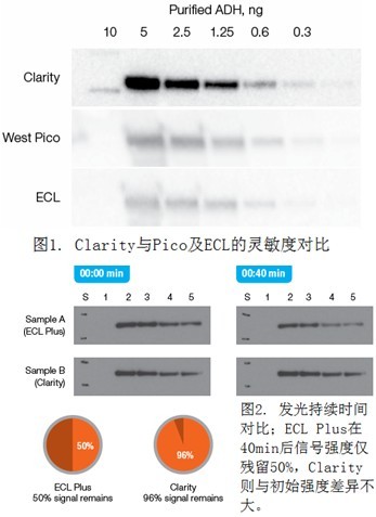 Clarity Western化學(xué)發(fā)光底物的靈敏度優(yōu)于目前市場上流行的各種產(chǎn)品,如Thermo公司的SuperSignal West Pico及GE公司的ECL(見圖1),令用戶能夠輕易檢測到低表達(dá)量的目標(biāo)蛋白。除此之外,Clarity對使用膠片成像的用戶來說,還有另外一大優(yōu)點就是發(fā)光持續(xù)時間長達(dá)24小時,令用戶能輕松優(yōu)化曝光時間等參數(shù),得到優(yōu)異的圖像結(jié)果。例如,對于相同的樣品,ECL Plus 和 Clarity 底物孵育后立即進(jìn)行膠片曝光,并在 40 分鐘后再進(jìn)行一次曝光。從剩余信號強度比例來看,Clarity 比 ECL Plus 信號持續(xù)能力優(yōu)異的多。