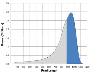 | 圖1 GS FLX+系統(tǒng)用2.8軟件對人DNA樣本進行測序后的結(jié)果。曲線顯示出堿基數(shù)隨著序列長度的分布情況。藍色部分與陰影交界處可看出50%的總堿基數(shù)與序列長度對應關(guān)系。不同測序結(jié)果與樣本特性與基因組特性有關(guān)。 |