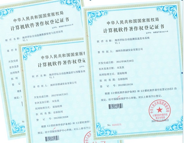 由深圳市朗誠實業有限公司自主開發的海洋浮標自動監測數據管理與應用系統、海洋浮標自動監測監控與預警系統、海洋浮標自動監測信息發布系統等3項系統軟件,根據《計算機軟件保護條例》及《計算機軟件著作權登記辦法》的規定,經中國版權保護中心審核,于2012年12月同時獲得了國家版權局頒發的計算機軟件著作權登記證書,這是繼2011年11月獲得“海洋浮標自動監測系統V1.1”計算機軟件著作權登記證書之后,又獲得的3項國家計算機軟件著作權登記證書。