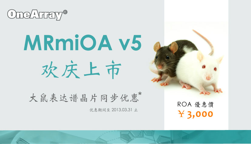 MRmiOA V5 (Mouse & Rat miRNA OneArray®) 為小鼠與大鼠微小核醣核酸(miRNA)表達譜芯片,是以 Sanger miRBase (Release 19 版本) 所公布之miRNA為偵測目標之產品,可達到小鼠以及大鼠之所有成熟 miRNA 序列 100 % 的覆蓋率。