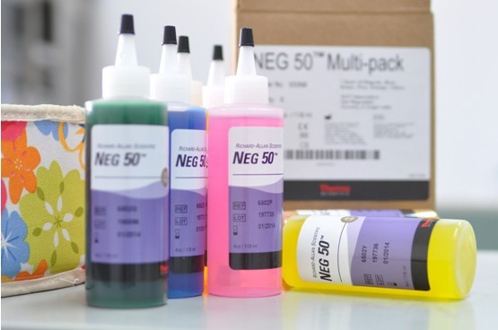在以往的冰凍切片中大家使用的冰凍包埋劑(OCT)多為無色的,無色的冰凍包埋劑(OCT)經過在冰凍切片機上冷凍就成為白色的填充物,它可以滲透入組織間隙起到保護和襯托作用。但是在有些實驗中都用無色包埋劑對應不同的樣本難免會產生混淆。THERMO公司現在可以提供六種顏色(蘭,綠,橙,粉,黃和無色)的包埋劑作為選擇,該包埋劑既可以保證在零下50度時仍能有穩定高質量的冰凍切片,同時也確保染色后沒有任何殘留。