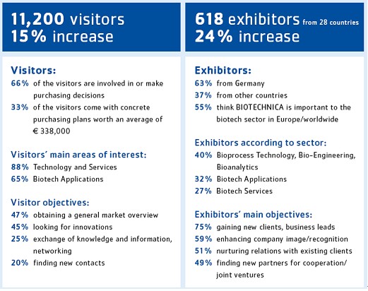 BIOTECHNICA 是一個(gè)真正意義上的行業(yè)交流平臺(tái)。2011年的參展商數(shù)量增加24%,觀眾反應(yīng)良好。由此我們對(duì)2013年的展會(huì)充滿信心。