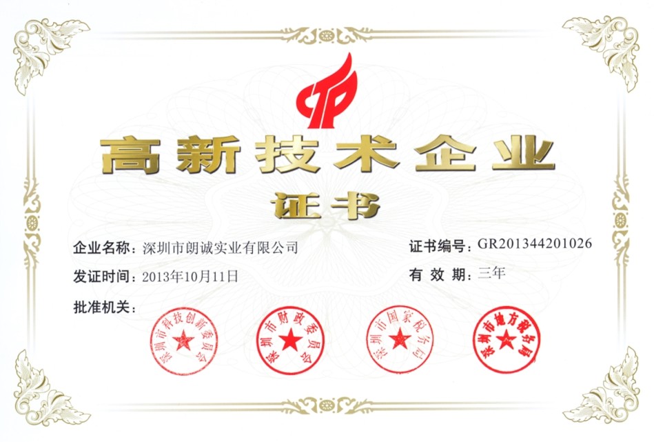 近日,深圳市朗誠實業有限公司順利通過了高新技術企業認定審查,正式獲得由深圳市科技創新委員會、深圳市財政委員會、深圳市國家稅務局、深圳市地方稅務局聯合頒發的“高新技術企業證書”(編號:GR201344201026),成為深圳市2013年第二批國家級高新技術企業之一。
