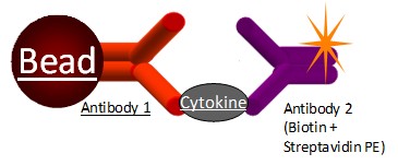 Aimplex流式高通量多因子檢測基于微球的檢測法原理,與常規的夾心法免疫測定相同。熒光聚苯乙烯微球被抗原特異的抗體包被,已包被抗體的微球混合物與樣本孵育,樣本中的待檢物(如細胞因子等)與微球上包被的抗體結合,然后加入生物素標記的抗體混合物,與結合于捕獲抗體(微球)的待檢物特異性結合。加入Streptavidin-PE,與生物素結合。用流式細胞儀(488nm)檢測熒光,結合抗原標準品,可實現對蛋白抗原的定量檢測。