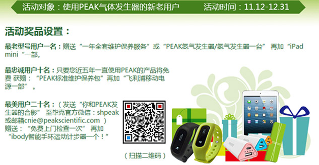 為回饋廣大用戶一直以來對PEAK公司的青睞和支持,PEAK公司重磅出擊,推出《尋找老用戶,免費贏取氮氣/氫氣發生器》活動:不僅贈送PEAK氫氣/氮氣發生器,還有贈送“售后年度維護合同”更有機會贏取Ipad mini, 飛利浦移動充,ibody運動智能手環等好禮。