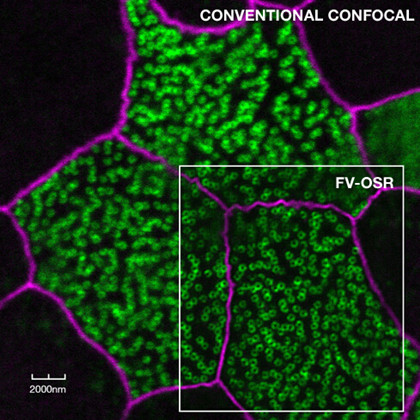 奧林巴斯獨創的超高分辨技術FV-OSR,是本次發布會上推出的一個全新技術解決方案,結合了眾多精良的光學部件和超高靈敏度探測器,成功將傳統共聚焦顯微鏡的分辨率提高了兩倍,理想條件下XY水平分辨率可達120~150 nm。此外,這項獨創的技術解決方案,實現了簡化操作和廣泛兼容等新特性,將共聚焦技術與特制的超分辨光學附件相結合,可以在目前科研領域廣泛使用的共聚焦系統上升級,使得FV-OSR成為了一個可以輕松實現原創超高分辨技術的理想解決方案,推動行業真正進入了超高分辨率時代。