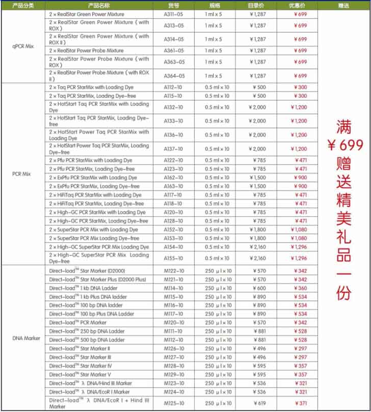 PCR Mix和DNA Marker系列六折優惠,滿¥699有精美禮品贈送。