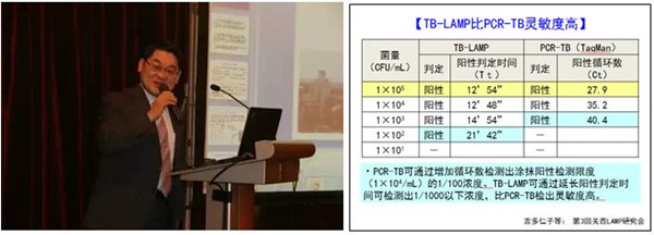 由于病原和宿主的變化,一些結(jié)核病的癥狀并不典型,而且有可能發(fā)生結(jié)核分枝桿菌與非結(jié)核分枝桿菌共同感染。日本橋本章司主任部長舉多個病例驗證TB-LAMP不僅在診斷單純結(jié)核病中的準(zhǔn)確性高,在結(jié)核分枝桿菌與鳥胞內(nèi)分枝桿菌復(fù)合群共同感染的病例中TB-LAMP也顯示出優(yōu)越的敏感性,1)在患者初診時咳痰的抗酸菌涂抹呈陽性,PCR-TB呈陰性,培養(yǎng)鑒別也判定為MAC,但用咳痰溶解液沉渣進行TB-LAMP檢測,35~40分呈陽性結(jié)果,因此診斷為肺結(jié)核病。2)使用咳痰溶解液沉渣的TB-LAMP,可檢測出涂抹陽性檢測限度的1/1000濃度的結(jié)核菌,比PCR-TB的靈敏度高10倍以上。3)高濃度(涂抹陽性)的MAC共存下,PCR-TB對涂抹陽性的結(jié)核菌都很難檢測出來,而TB-LAMP可檢測出1╱1000量的結(jié)核菌,非常有用,準(zhǔn)確率極高,全面介紹了TB-LAMP的臨床應(yīng)用價值。