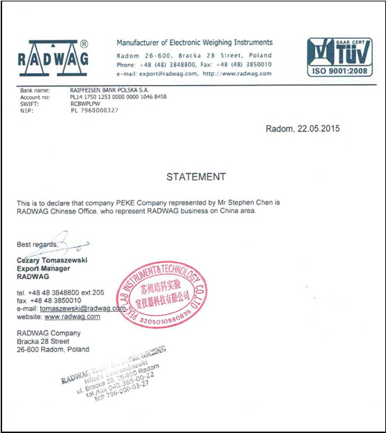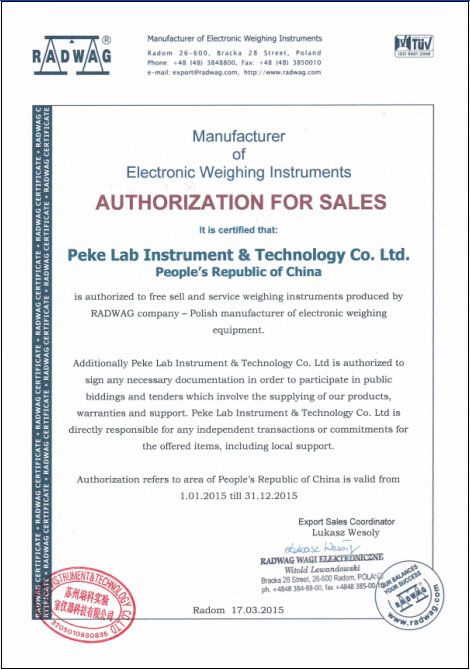 2015年1月1日,蘇州培科實驗室儀器科技有限公司正式被授予波蘭RADWAG中國區總代理,并設立RADWAG中國辦事處。全權負責波蘭RADWAG在華的售后和技術支持。