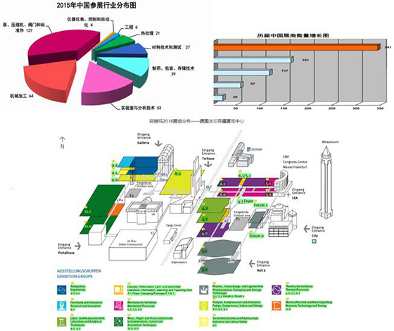 官方數據統計2009-2015:2012年阿赫瑪共計來自57個國際和地區的3,773家獨立參展商,136,400平方米凈展出面積來自所有五大洲的167,000名觀眾,206家中國大陸展商,共展出3,097平米。比2009年實現雙翻倍。2012年我司帶團50家中國企業,近150人參加此展會。2015年德國阿赫瑪擁有56個國家的3,813家參展商展示了化工、制藥和食品工業方面最新的技術和發展。相較上一屆2012年,2015阿赫瑪展出總面積達到133,436 m²。來自德國以外的國際參展商數量首次超過總參展商數的一半,達到53.9%。中國以4,937 m²的凈展出總面積首次成為了僅次于德國的第二大參展國,相比上屆增長超過50%。 其中增長最明顯的來自于制藥、包裝和存儲技術行業。楚天科技、上海東富龍、琺瑪珈(廣州)包裝設備和山東新華醫療等國內知名制藥設備廠商都分別租用了超過100 平米的面積,并展出了其成套實物設備。不僅面積,中國展商總數也再次實現翻番達到了296家。