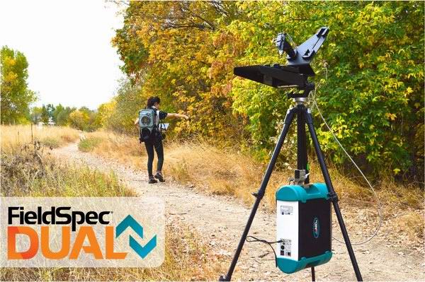 在Dual軟件設置中,一臺FieldSpec作為固定基地單元(FBU),連續采集參考白板的測量數據。另一臺儀器作為移動單元(MU),自由收集光譜信息,而不必再測量白板。兩臺儀器通過筆記本電腦和 Dual軟件實現通訊、內部校準和同步測量。