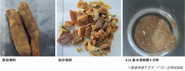 在制備為試樣水解液之前,還有非常關鍵的一部——粉碎/研磨——直接關系到紅參中有效成分的釋放。請參考A11基本型對紅參的實際研磨效果: