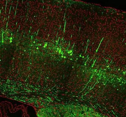 鐘秋園作品《小鼠鼠腦冠狀面神經元精細雙色圖》