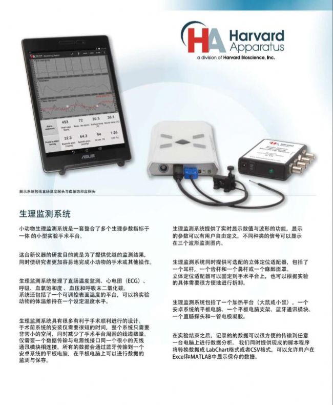 美國Harvard推出新產品-平板式小動物生理監測系統。小動物生理監測系統是一套整合了多個生理參數指標于一體的小型實驗手術平臺。這臺新儀器的研發目的就是為了提供優越的監測結果,同時使研究者更加容易地完成小動物的手術或其他操作。