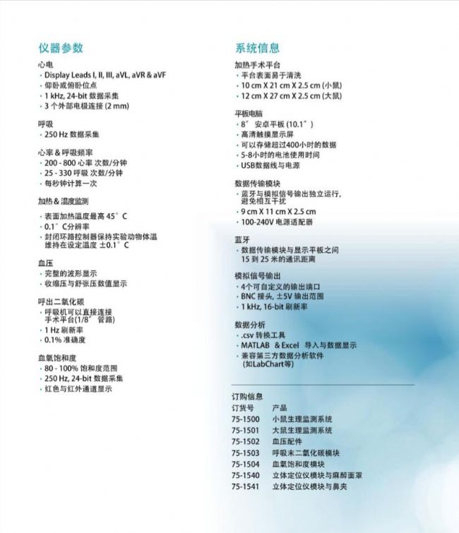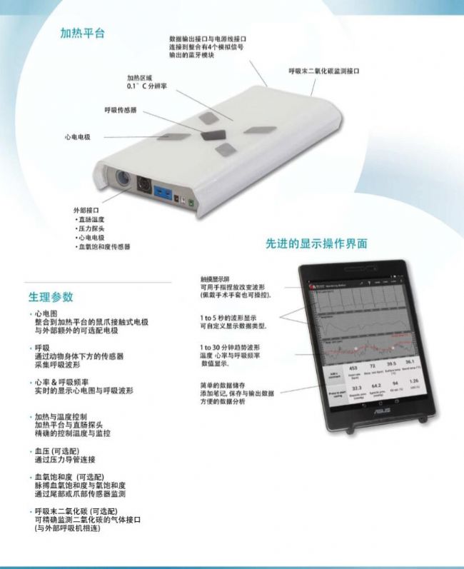 生理監測系統整理了直腸溫度監測、心電圖(ECG)、呼吸、血氣飽和度、血壓和呼吸末二氧化碳。系統還包括了一個可調控表面溫度的平臺,可以將實驗動物的體溫維持在一個設定溫度水平。
