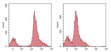 分別運(yùn)用配備561nm激光的PE通道以及 595/20 BP 濾光片的 CytoFLEX S 流式細(xì)胞儀,以及配備 488nm 激光的 ECD 通道和標(biāo)準(zhǔn) 595/20 BP濾光片的CytoFLEX流式細(xì)胞儀,對 mCherry 表達(dá)細(xì)胞株進(jìn)行分析。