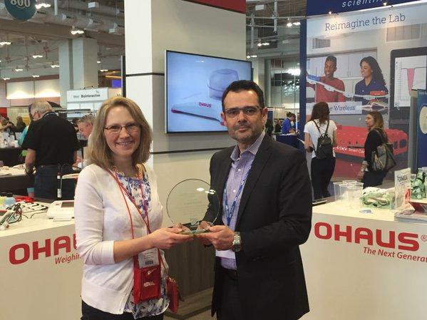 (2016 Gustav OHAUS Award 獲得者Laura Finney, Laura Finney是一位來自于美國Donnell中學的科學教師,因教學方式的創新而獲此獎項; 上圖為她和奧豪斯美國總經理Jean-YvesChever在美國科學教師協會2016年會中合影)