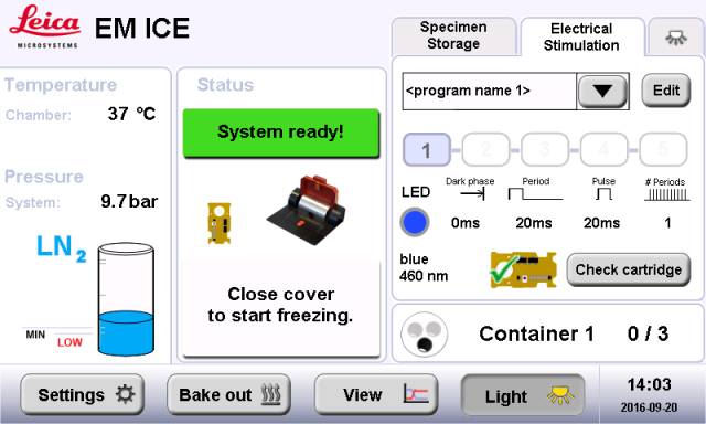 Leica EM ICE電刺激控制界面,可對電刺激功能進行精細化定制,設定連續電刺激/脈沖式電刺激/刺激時間等。