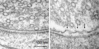 左圖:未受電刺激對照組;右圖:受電刺激后,箭頭部分顯示突觸囊泡的融合現象