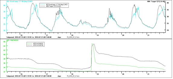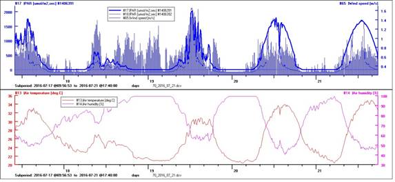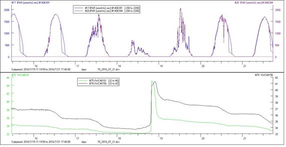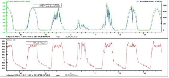 上圖是凈輻射和光和有效輻射以及供電電壓曲線圖,從這個圖中我們可以看到整套系統的“健康”狀況,