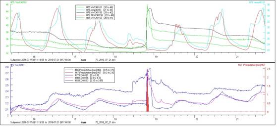 PAR光合有效輻射傳感器和土壤水分傳感器的變化曲線對比圖